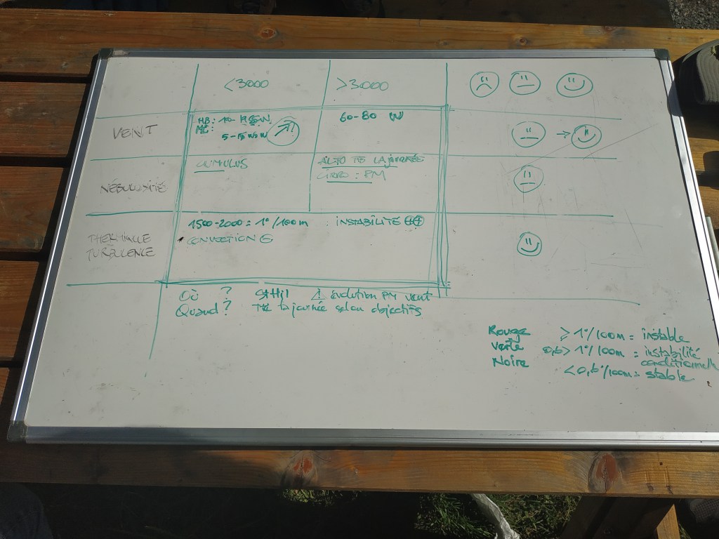 La journée tire à sa fin et le débrief nous permet de faire le point sur nos attitudes mentales avant, pendant et après vols (très instructif, même si au début on se demandait où il voulait en venir : au pinaise on est tombé sur un psy :o). Petit point sur la météo et les paramètres à vérifier (on a le tableau miracle !)