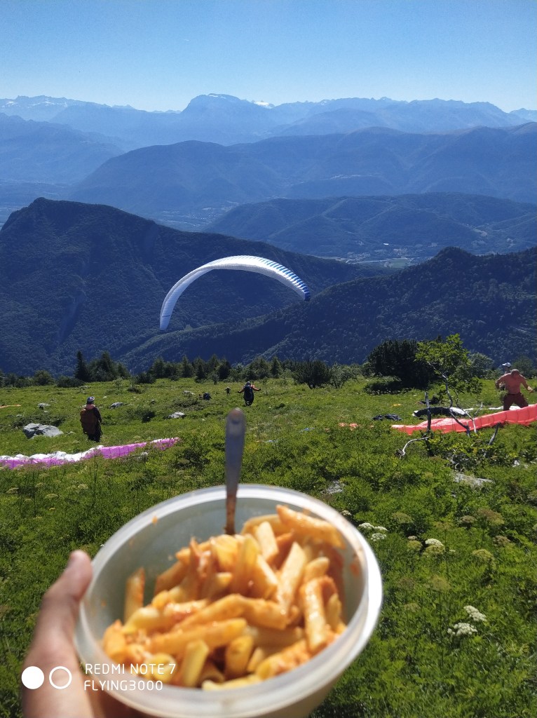 Il paraît que ça va décoller à 10h, de ce que dis Man’s. En tout cas, ça risque d’être un gros Col Vert pour ma première journée fumante dispo de l’année. Il y en a eu d’autres, mais j’étais soit en Amérique du Sud avec la Susi 3, soit en Bourgogne confiné, l’aile tout de même dépliée dans le salon. Je pose donc mon Lundi suite à la proposition de Man’s, toujours dans les bons coups. On se retrouve à Comboire avec Jean-Brice (qui fera 250kil) et Philippe G. pour covoiturer au stade du Gua. Ensuite direction le déco, et effectivement, ça décolle à 10h ! Je prends tout de même le temps de faire un peu de jardinage autour de mon aile, de manger mon plat de pâtes au pesto avant de m’équiper et de partir à 10h20.