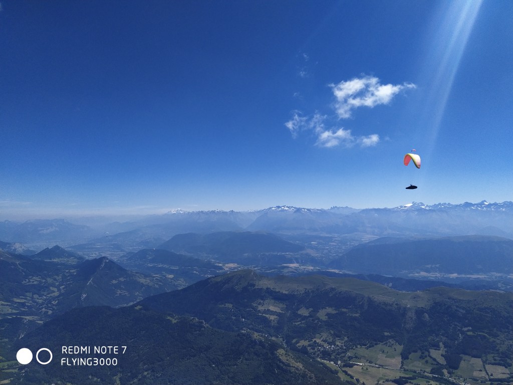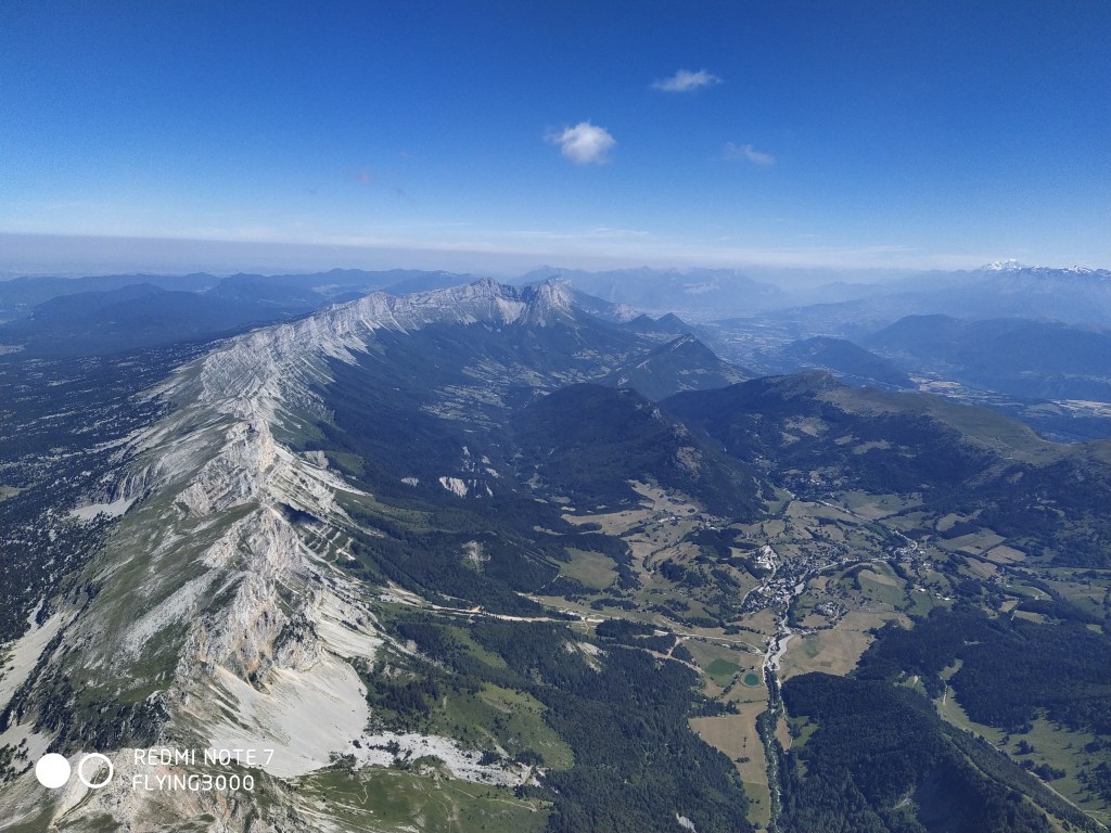 L’extraction est d’une simplicité étonnante aujourd’hui, ça change de d’habitude ou le tas n’est pas exclus si le cycle n’est pas là. Une fois aux crêtes, on sent le vent d’Ouest, ce qui n’est pas très dérangeant mais pas très agréable non plus. Je chemine au premier barreau pour rattraper ma faible vitesse moyenne bras-hauts… et accessoirement les autres. A mon arrivée au Grand Veymont, tout le monde a déjà fait demi-tour depuis un petit moment sauf Toup qui lui part au Sud. Il est joueur ! Je profite du thermique tonique face Sud du Grand Veymont pour faire un plaf à 3000 et admirer la vue dégagée sur tous les massifs alentours et apercevoir Meije, Alpe d’Huez, Obiou ou encore Mont Blanc… C’est la première fois que la vue est si claire et nette, un régal !
