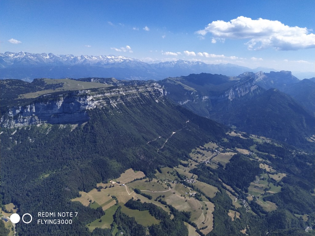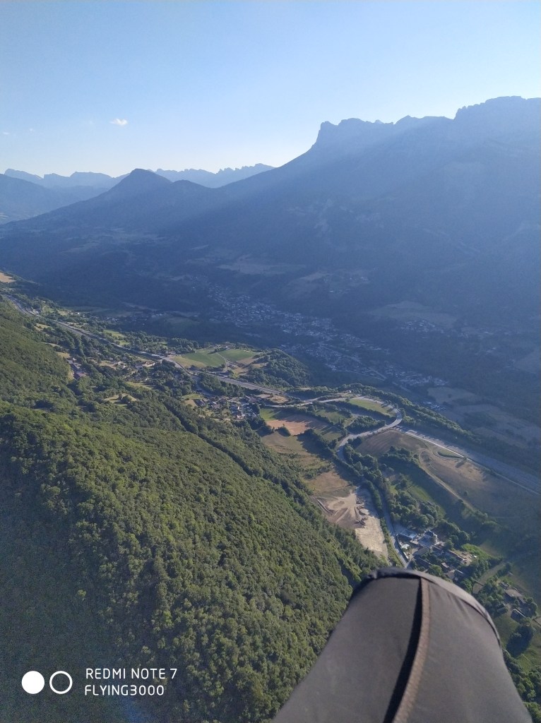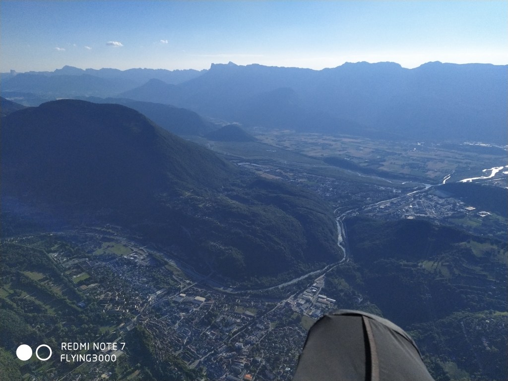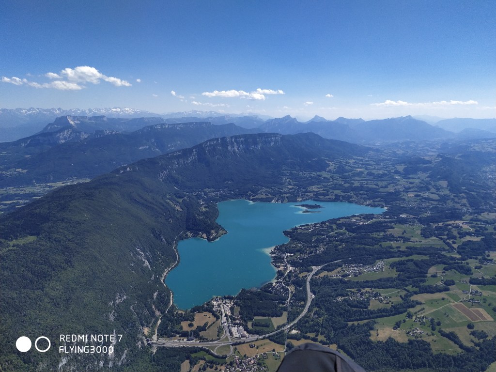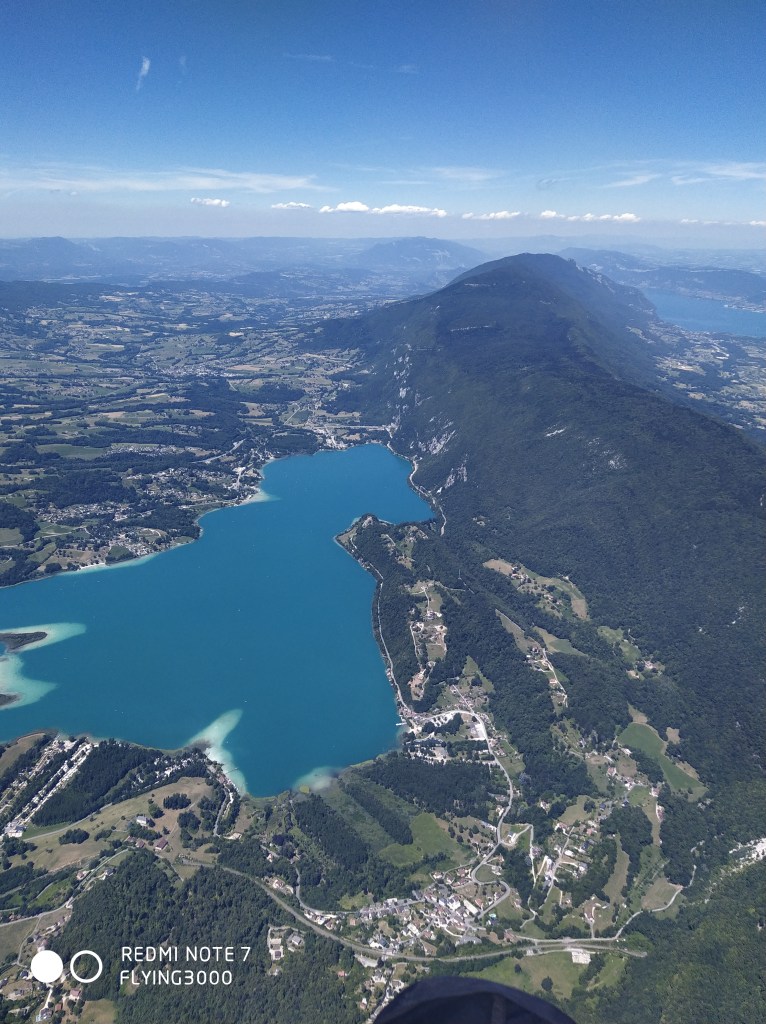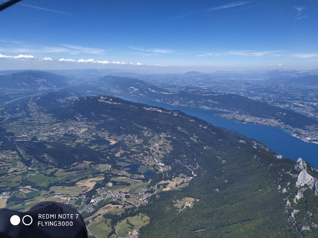 A cet instant, mon plan de vol est clair : aller voir si le lac d’Aiguebelette y est encore. Après 20 grosses minutes de glide, je raccroche tranquillement Bande et continue vers les grille-pains, puis la Dent du Chat. Je ne perds pas de vu ma motivation du vol : assurer pour maximiser mes chances de ne pas faire d’erreurs d’appréciation d’altitude dont j’ai le secret (cf : https://www.youtube.com/watch?v=OAXw_8T9cew). En allant à la Dent du Chat, je croise Aurélie B. avec qui on a rapidement discuté de ce vol le matin même en montant au parking. Elle est en avance sur moi, en même temps ce n’est pas étonnant vu la vitesse de ma Taska, malgré un premier barreau toujours actif. En empruntant un thermique avant le relais du Chat, je me rends compte que je ne connais pas l’altitude maximale autorisée ici… Le thermique bleu que j’enroule monte fort jusqu’à 2000m mais celui-ci me fait prendre à 200m de plus alors que j’essaye d’en sortir. Je n’ai jamais eu autant de gaz ici, je fais souvent l’A/R en minimisant le temps passé à enrouler : j’en profite donc pour tenter d’aller légèrement au Nord pour survoler Saint Jean de Chevelu. De l’autre côté, je vois des ailes sur le Mont Charvaz… Je suis fortement tenté mais il est déjà 15h et je ressens un peu de S/SO donc je quitte les lieux.