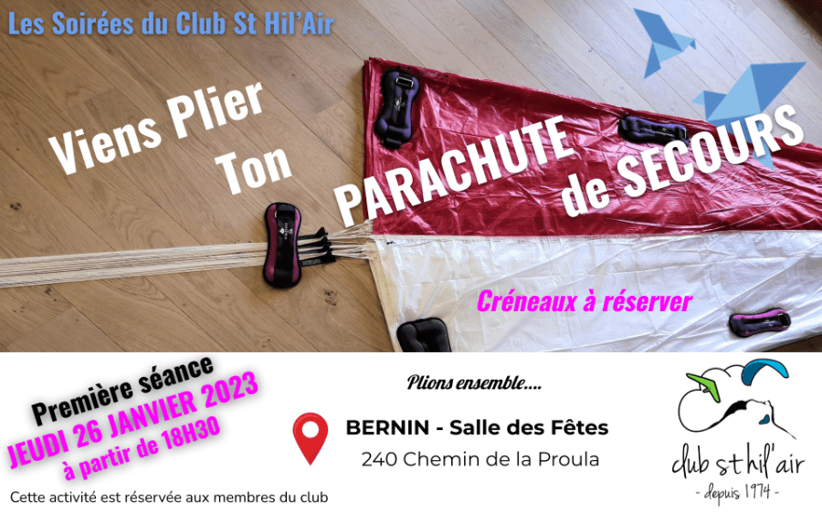 Le club vous a programmé deux séances de pliages de parachutes de secours. La première sera le jeudi 26 janvier et la deuxième le jeudi 16 février.