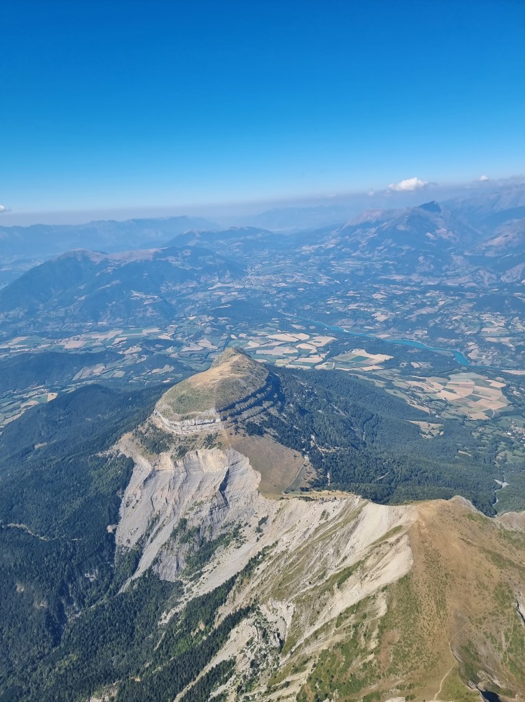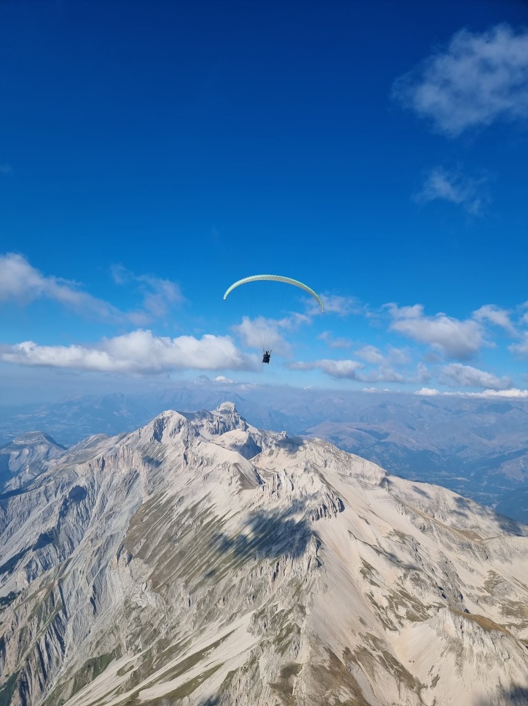 De retour sur l’Obiou, avec Jérémie on a filé sur le Grand-Ferrand en suivant Laure qui nous a ouvert la trace cette fois. Devant, on voit des voiles super hautes, ça monte bien, nous sommes plusieurs à franchir les 3000m ! Un planeur se promène un coup dessus, un coup dessous, c’est assez impressionnant. Mon pilote décide donc de tirer plus au sud, on va visiter la Drôme et border les Hautes-Alpes.