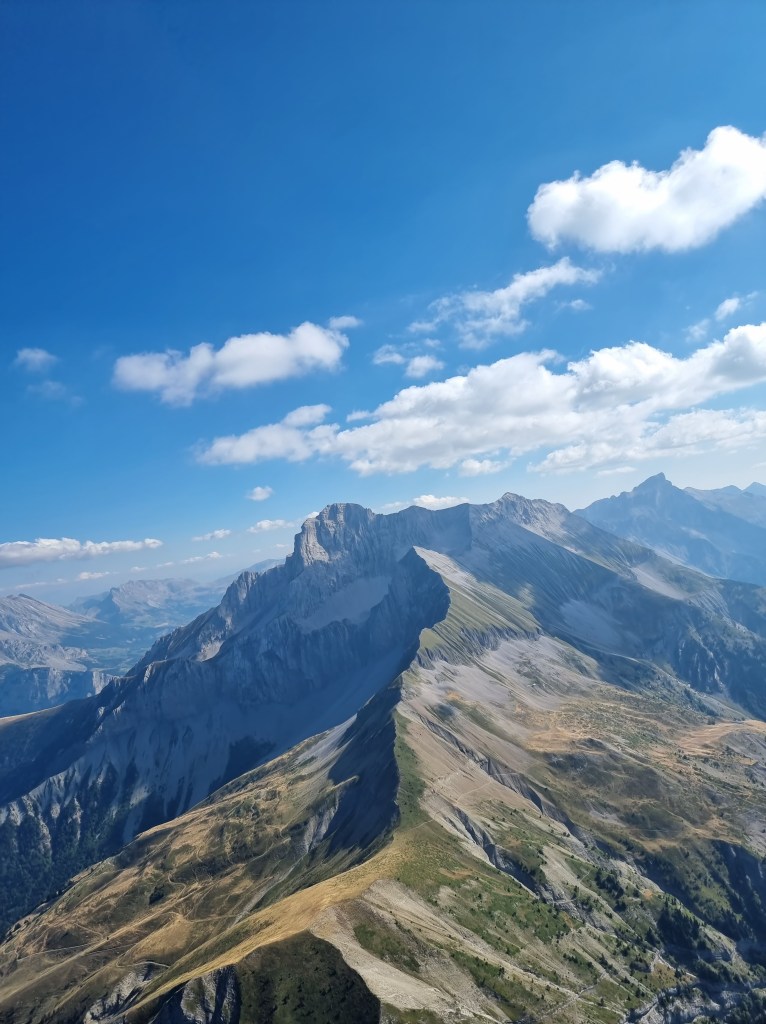 Nous, on a fait Chatel en premier, nous avions une bonne hauteur, on titille les 3000m, heureusement car il y avait une bonne dégueulante pour l’aller-retour à Chatel. On coule comme des cailloux ! Mon niveau premières plumes me fait dire qu’il y a une montagne pas loin sous nos pieds quand même. Évidemment, le pilote confirmé qu’est Jérémie, me rappellera qu’on est largement bon. Bien sûr, il a raison. On remontera jusqu’en haut. On a vu plusieurs pilotes Bernard, Laure… Je tente des photos, pas fantastique on est un peu loin. À la radio, si nombreux et éparpillés, on ne comprend pas toujours tout ce qui est dit. L’essentiel c’est que personne n’a appelé pour des urgences !