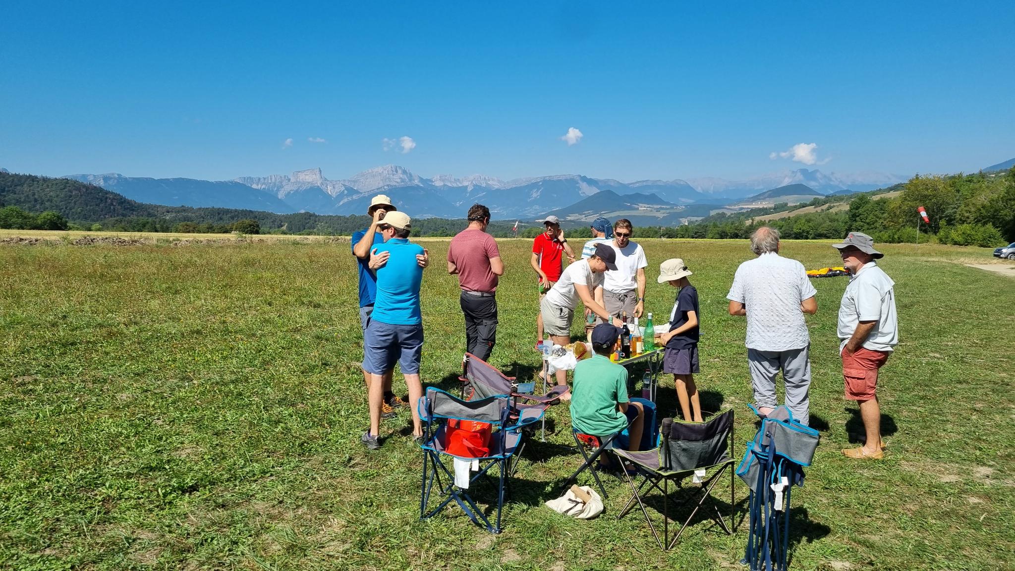 Après le pliage, on rejoint les pilotes déjà à l’apéro ! Évidemment, debrief pour tous autour d’un verre, pendant certains sont encore en l’air, on discute, on se donne des infos et des retours. D’autres pilotes du coin se joindront aussi. Sur un moment de folie, je demande qui veut remonter, Thierry répond présent ! Après vérification avec Jérôme, il nous annonce que le déco est encore bon. Je pars en voile solo cette fois. Un local nous monte, et hop on y va. Bon, cela sera un plouf, rien à gratter pour nous remonter, mais tant pis c’est sympa quand même. (Encore du boulot pour mes atterrissages, sans commentaires, c’est mon pic de stress). Quand on pose c’est déjà tard, la fin du groupe arrive aussi, pliage, derniers papotages et on s’en va. Il ne reste plus grand monde, la majorité a pris la route, demain travail pour la plupart… Une journée bien remplie et fort sympathique ! Rendez-vous l’année prochaine pour les 50 ans, en visant un vol de groupe de 50 pilotes pour 50km !