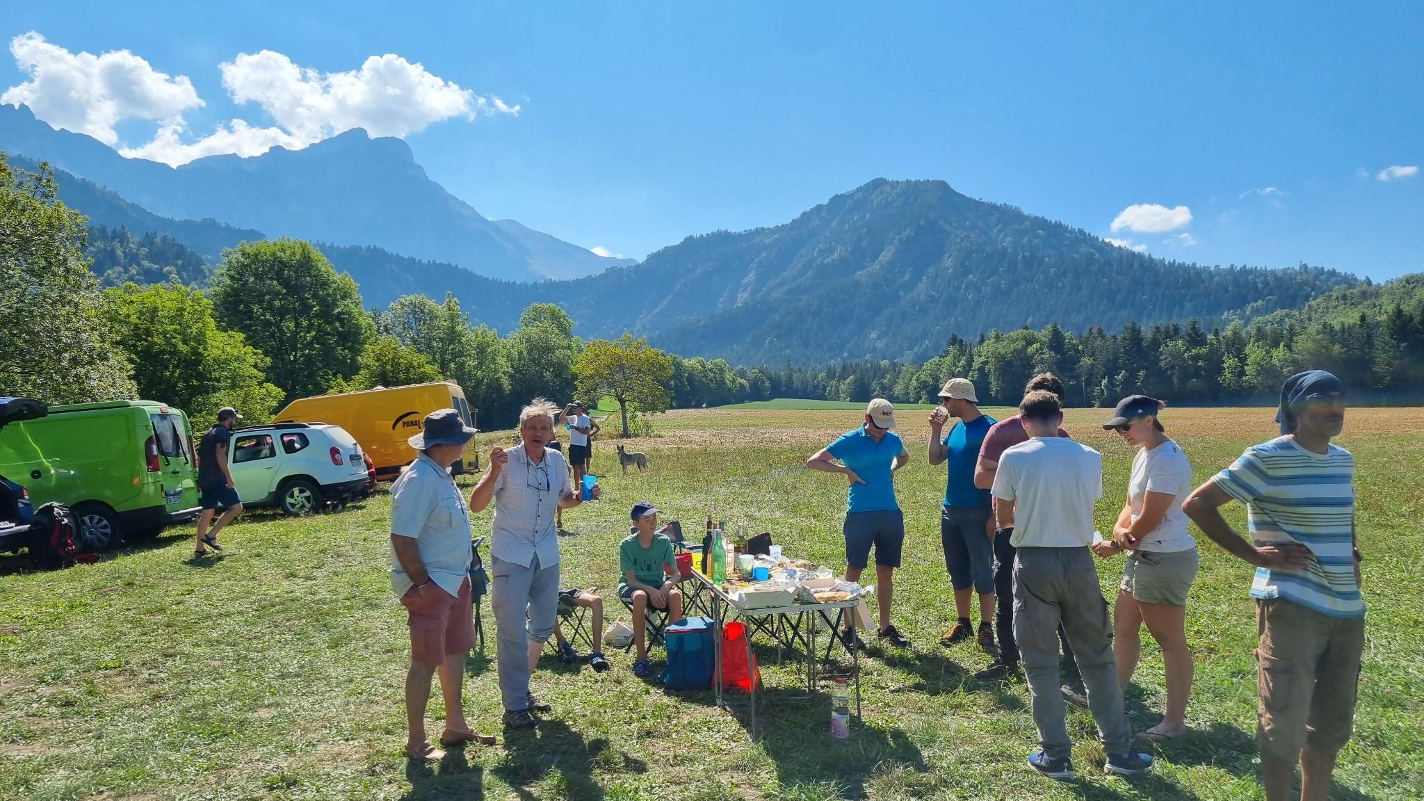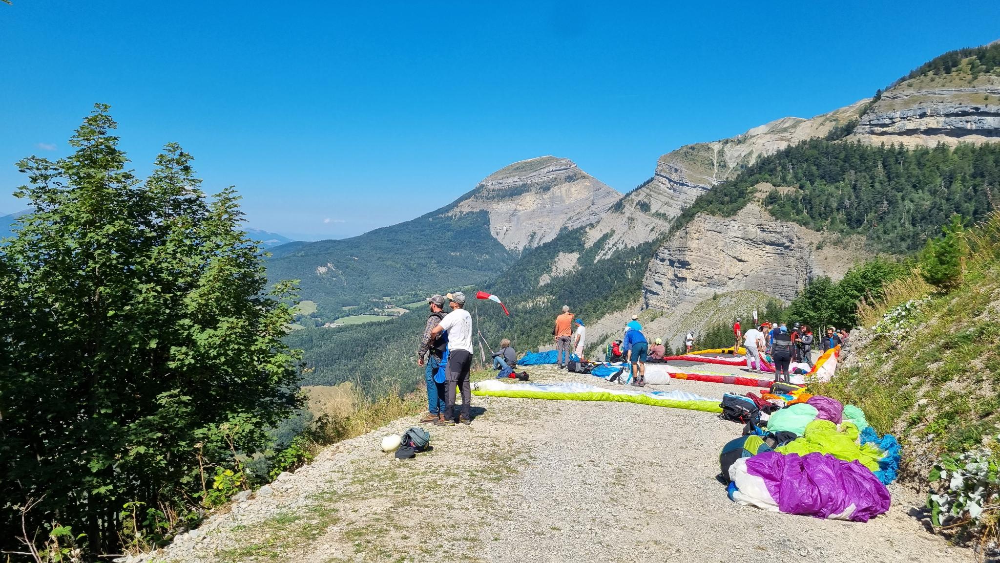 Après le déjeuner où l’on commence à bien sentir la chaleur, JB se charge du briefing, et c’est parti, organisation des voitures. Chacun trouve une place, pour lui et pour son parapente, pas besoin d’être ensemble, on va tous au même endroit !